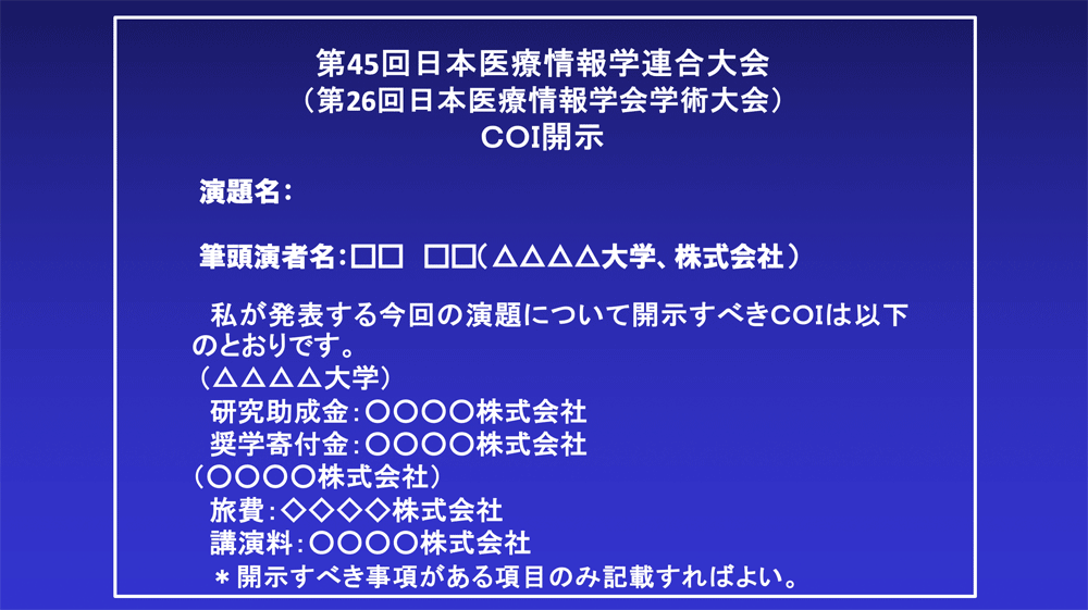 すべての発表者は、自分が発表する内容に関する利益相反状態を開示してください。口頭発表の場合はスライド等で、ポスター発表の場合はポスター等で開示してください(例1)。